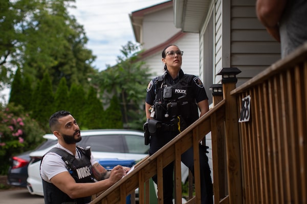 On one Friday in June, Mr. Haidar and his partner that day, Windsor Police Constable Jordyn Thompson, started their 12-hour shift with a visit to the Downtown Mission of Windsor, a 96-bed shelter. Const. Thompson was dressed in her patrolwoman’s uniform, a gun at her hip. Mr. Haidar wore a white T-shirt under a black vest emblazoned with his job title: Nurse.
