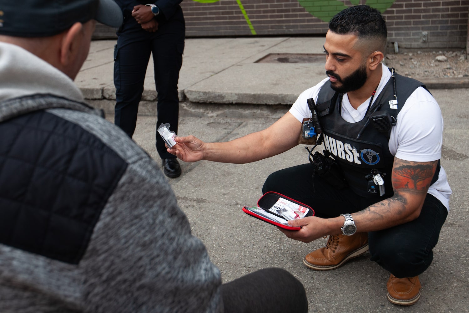 ER nurses in the nurse-police teams try to prevent that trickle-down effect by cleaning and dressing wounds, sometimes in a makeshift nursing office at the Mission. The nurses occasionally remove stitches. They often hand out kits of the overdose-reversing drug naloxone and strips to test street drugs for fentanyl, the potent synthetic opioid fuelling a national overdose crisis.