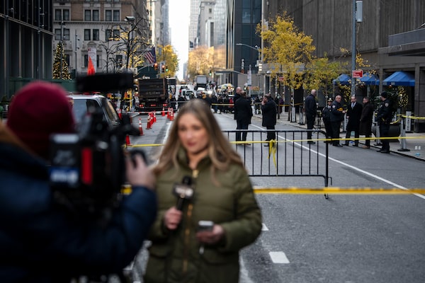 A television reporter works near the scene of the fatal shooting of Brian Thompson, a top UnitedHealthcare executive, in Manhattan, on Dec. 4.KARSTEN MORAN/The New York Times News Service