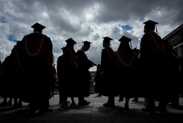 Graduating Beedie School of Business students wait for a convocation ceremony to begin at Simon Fraser University, in Burnaby, B.C., on June 12, 2024. A recent Abacus poll found that 75 per cent of Canadians want governments to spend more on university funding.DARRYL DYCK/The Canadian Press