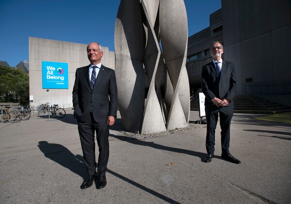 Meric Gertler, left, president of the University of Toronto, and Trevor Young, dean of the faculty of medicine, pose for a photograph outside the medical sciences building on Sept. 23, 2020.Fred Lum/The Globe and Mail