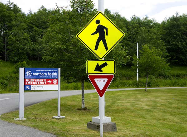A sign points the way to the emergency room at the hospital in Kitimat, B.C. The hospital’s ER crisis peaked in January, 2024, when it was shuttered for almost 250 hours.Robin Rowland/The Globe and Mail