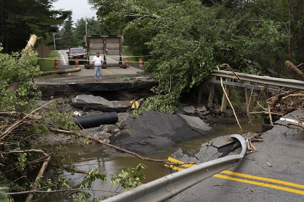 A motorist stops to survey the damage to a washed-out bridge near Newport Corner, N.S., July 23, 2023.Darren Calabrese/The Canadian Press
