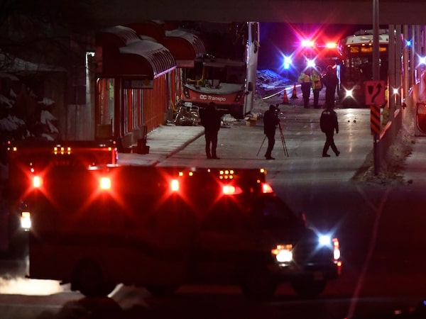 Police and a first responders work at the scene where a double-decker city bus struck a transit shelter in Ottawa, on Jan. 11, 2019.Justin Tang/The Canadian Press