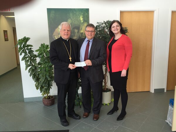 Ananias Mission co-founders Ed Wethli, middle, and Jennifer Allison give their first cheque to Bishop Gerard Bergie of the Diocese of St. Catharines.
