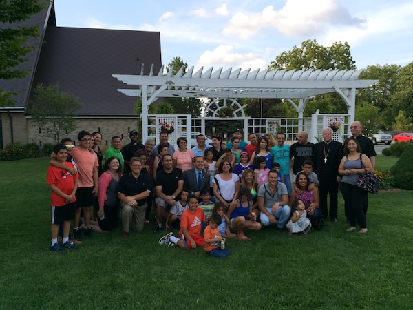 A church barbecue held at St Patrick's Parish in Niagara Falls, Canada, brought together the Syrian refugees who had arrived in the diocese. Kneeling in the front are Ananias Mission co-founders, front left, Jennifer Allison and Ed Wethli.Katheryn Wethli
