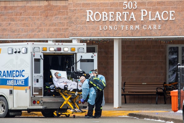 Paramedics transport a patient from Roberta Place, a long term seniors care facility which is the site of a COVID-19 outbreak, in Barrie, Ont., on Jan. 18, 2021.CARLOS OSORIO/Reuters