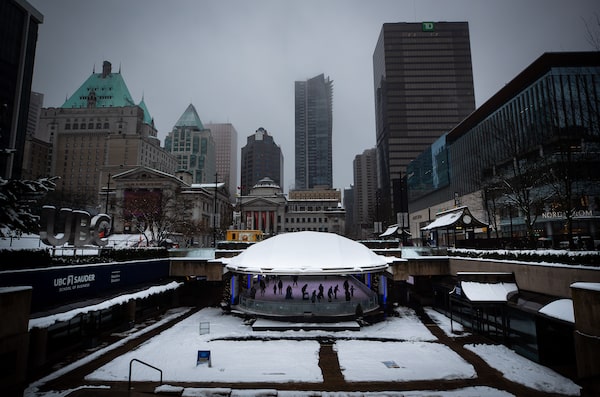 People skate under the snow-covered dome roof at the Robson Square ice rink as rain falls in Vancouver on Jan. 6, 2022.DARRYL DYCK/The Canadian Press
