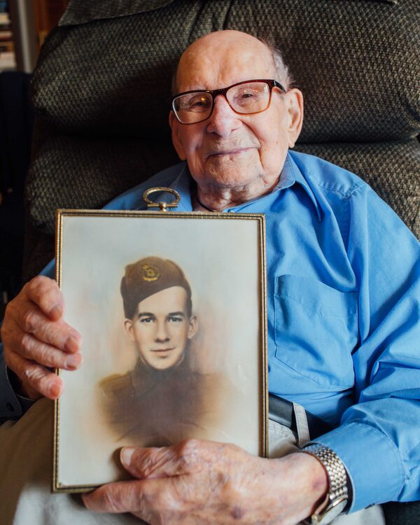 Veteran Hormidas Fredette, pictured in 2018, holds a picture of himself in his uniform when he was younger.Eric Brunt