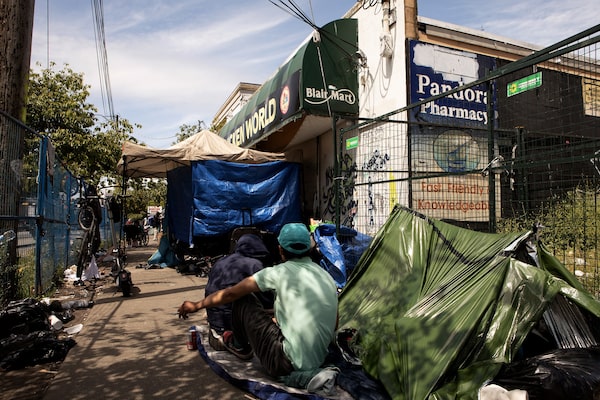 A population of homeless people continue to try and live in tents surrounded by blue fencing and makeshift sleeping areas in front of former businesses along Pandora Ave. in Victoria, B.C., on May 21, 2024.Chad Hipolito/The Globe and Mail
