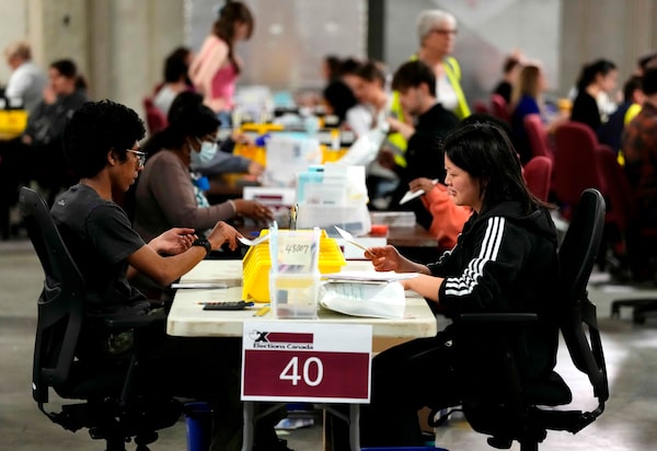 Election workers count ballots cast by Canadians outside their ridings at the Elections Canada Distribution Centre in Ottawa in April, 2025. Nearly five million Canadians live outside the country and roughly 3.5 million of them are eligible to vote says Timothy Veale, the director of Grits Abroad.Justin Tang/The Canadian Press