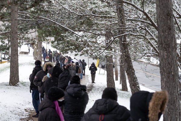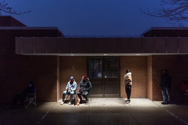 Local residents lined up outside the Driftwood Community Centre pop up vaccination site on Wednesday, April 21, 2021.YADER GUZMAN/The Globe and Mail