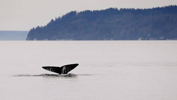 A grey whale shows its massive tail fluke while diving in Possession Sound, near Everett, Washington State.Elaine Thompson/The Associated Press