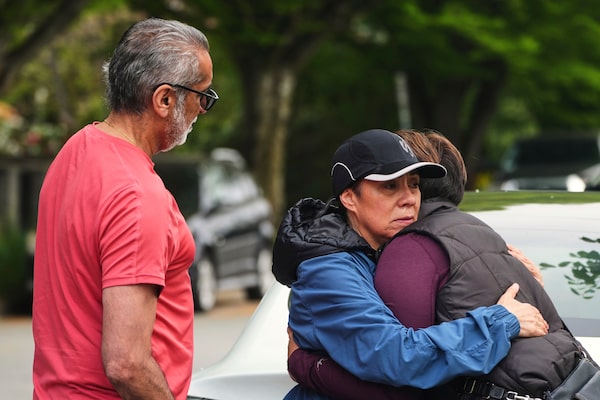 Esperanza Bermudez, centre, who lives across the street from the scene, is comforted by friends Ronnie Claire, right, and Manjit Claire, the morning after a driver killed multiple people during a Filipino community festival on April 27 in Vancouver.Lindsey Wasson/The Associated Press