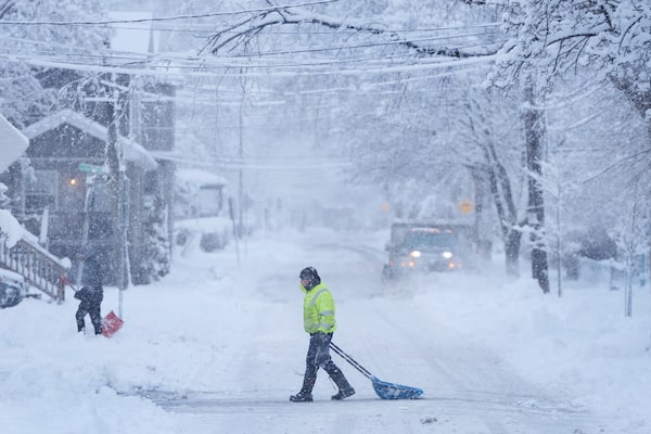 A person drags a shovel across a road during a winter storm in Halifax on Monday.Darren Calabrese/The Canadian Press