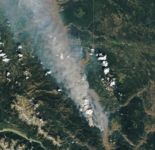 The McKay Creek fire in British Columbia, as seen from a NASA satellite on June 30. Natural colours have been overlaid with shortwave-infrared light to highlight the active fire.NASA Earth Observatory/AFP via Getty Images