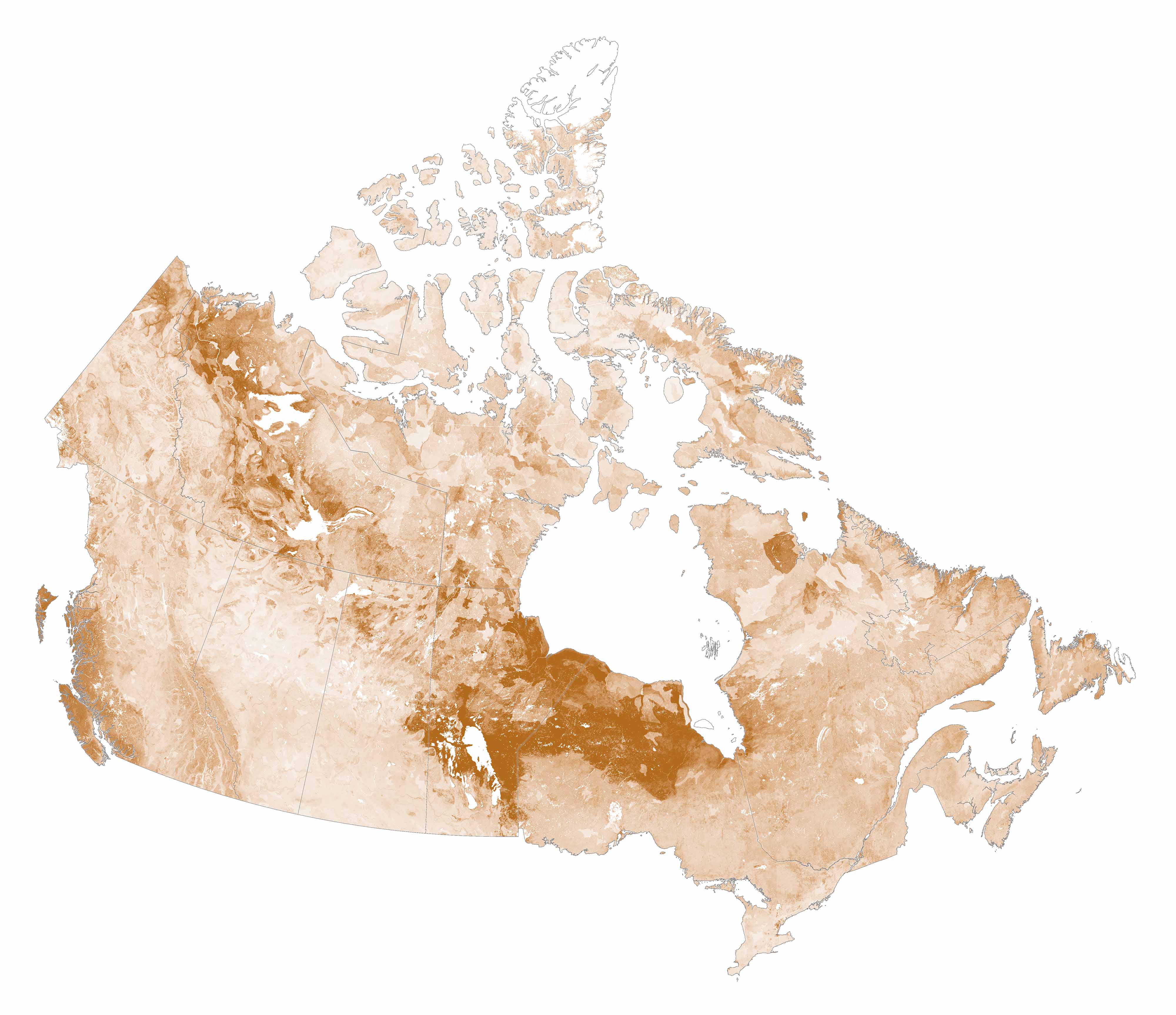 Sweeping northward, carbon-dense soil forms a diagonal band from the Mackenzie River Delta down to the northern reaches of the Prairies.