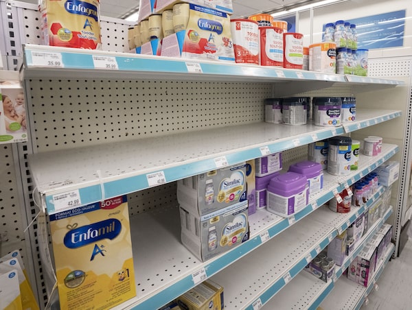 Shortages of many popular brands of baby formula on a pharmacy shelf in Montreal on May 16, 2022.Ryan Remiorz/The Canadian Press