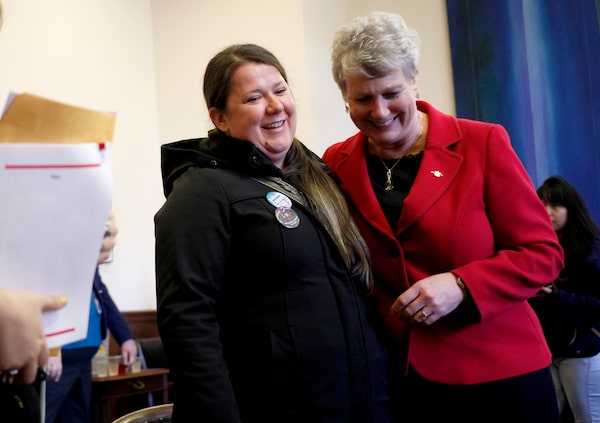 Katrine Conroy, B.C.'s Minister of Children and Family Development, right, shares a laugh with life skills program co-ordinator Sarah Benson in her office.Chad Hipolito/The Globe and Mail