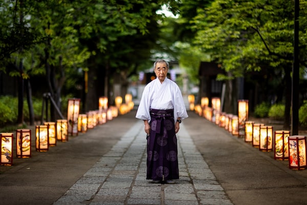 In Tokyo, after our 14-day quarantine, Nathan VanderKlippe and I spent time with Kunihiko Katori at his family’s Shinto shrine to sport. Later on, Katori obliged me returning when the light was low to photograph his portrait on the path lit by the lanterns dedicated to Olympic and Paralympic athletes. This quiet shrine, in the middle of such a sprawling city amidst the upheaval of the pandemic, seemed otherworldly. I hoped to capture that feeling, and Katori’s calmness, in this photograph.