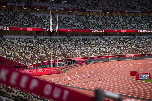 The view of the starting line ahead of the men’s 100-metre in a completely empty Tokyo Olympic Stadium. Here, the clock shows about 6:30 p.m. – a half-hour before the start of the first day of athletic events.