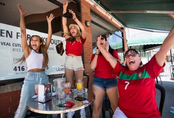 Soccer is always a draw in Toronto’s Little Italy neighbourhood, and never more so than during the 2021 UEFA European Championship. My day on June 15 involved going from bar to bar trying to find crowds that were okay with being photographed, and hoping that they would be enthusiastic while watching the game. Patrons at two bars declined to be photographed, but the third one was the charm. All I had to do was wait and watch and hope that something would happen. Fortunately for me, this group was more than emphatic in their reactions to game action and it was all I could do to keep up with them. Here we see Karen Pires, her daughter Rachel Pires, Jennifer Defraga, and her mom Marilia Defraga reacting to a goal by Portugal’s Cristiano Ronaldo on a penalty kick during a Euro Cup 2021 match against Hungary.