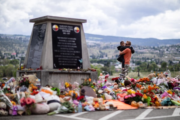 Also on June 6, Jesse Nowak hugged his daughter Charlee at the growing memorial outside of the former Kamloops Indian Residential School in Tk’emlúps te Secwepemc. Charlee’s maternal grandparents were residential-school survivors. Jesse said even though it was difficult to think about, the family needed to visit.