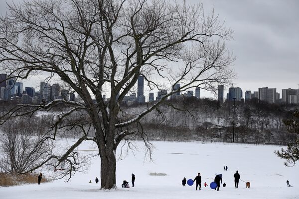 Families enjoy tobogganing at Riverdale Park East after snowfall in Toronto on Dec. 25, 2020.CHRIS HELGREN/Reuters