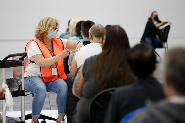 People receive their vaccinations from Karen Balzer at Manitoba’s new COVID-19 vaccination centre in a soccer complex in north Winnipeg on May 7, 2021.JOHN WOODS/The Canadian Press