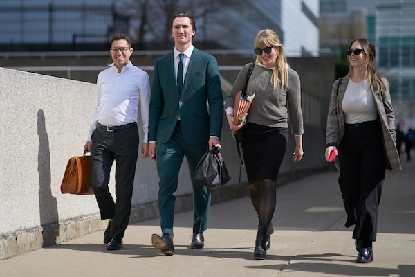 Daniel Brown, left, Alex Formenton, second from left, and Hilary Dudding, third from left, leave the courthouse in London, Ont. on May 8.Geoff Robins/The Canadian Press