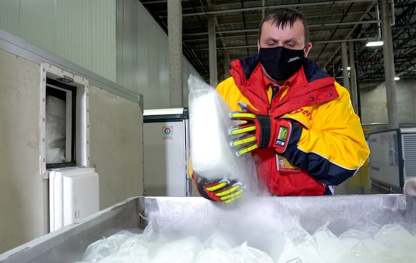 A DHL worker loads dry ice into 'Envirotainers' at a facility for the shipment of vaccines and medical supplies in Chicago.DHL/Handout via REUTERS