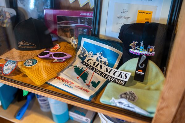 Back at the lodge, bumper stickers reading 'Mount Cain sucks, tell your friends' lie among shirts and other merchandise.