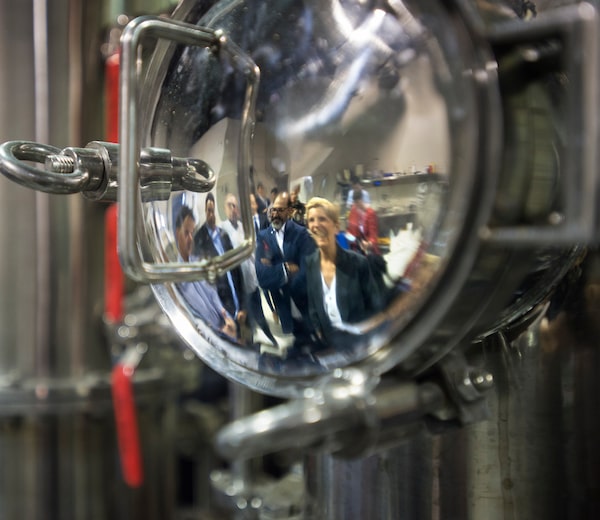 After a flight from Toronto, Ms. Wynne, reflected in distillation equipment, pays a visit to Crosscut Distillery in Sudbury, where she talked about jobs in Northern Ontario.Fred Lum/The Globe and Mail