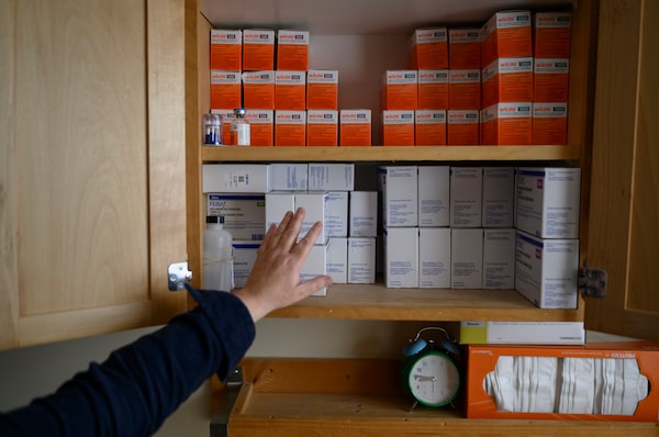 Michelle Howell goes through the cupboards full of medications and medical equipment while preparing her son's first round of infusions for his hemophilia early in the morning.Darren Calabrese/The Globe and Mail
