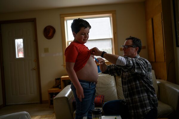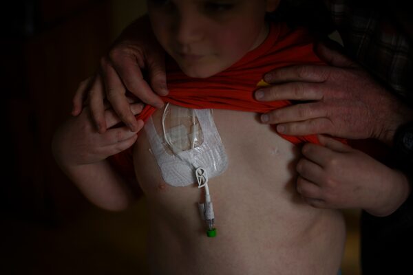 Colin Guthrie removes a syringe from Callum's implanted central line following the first round of infusions.Darren Calabrese/The Globe and Mail
