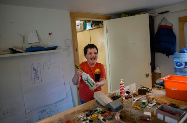 Callum Guthrie, 10, laughs after spraying his friend Javen (not pictured) with water while playing in his workshop.Darren Calabrese/The Globe and Mail