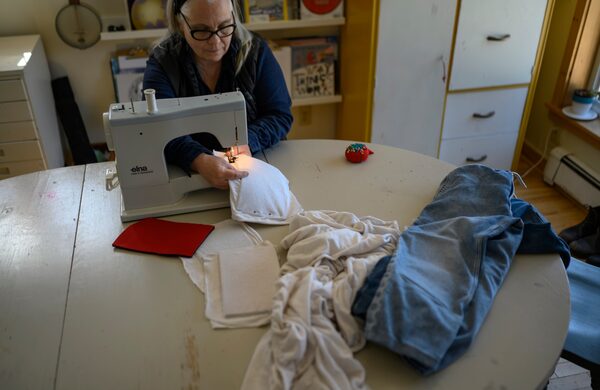 Michelle Howell sews pieces of neoprene from donated wetsuits into the knees of her son Callum's jeans for padding.Darren Calabrese/The Globe and Mail
