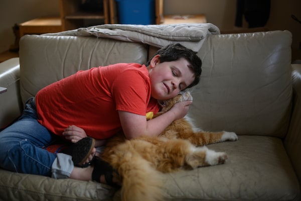 Callum Guthrie cuddles with his cat Stampy at home in Ketch Harbour, N.S. on April 29, 2019 after receiving the first round of lengthy infusions for hemophilia.Darren Calabrese/The Globe and Mail