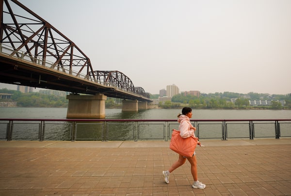 A person walks by the South Saskatchewan River in Saskatoon as smoke from wildfires burning across the Prairies blankets the city on May 20. The Saskatchewan Public Safety Agency is lifting a fire ban across the province after recent rainfall and cooler temperatures helped crews battle wildfires in the northern region.Heywood Yu/The Canadian Press