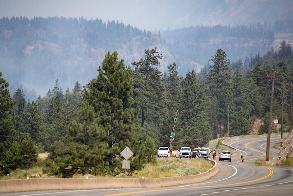 RCMP officers man a roadblock on the Trans-Canada Highway as wildfire burns in Lytton, B.C., on July 2, 2021. The BC Wildfire Service says there has been minimal growth in the past day of fire that destroyed much of the village of Lytton.DARRYL DYCK/The Canadian Press