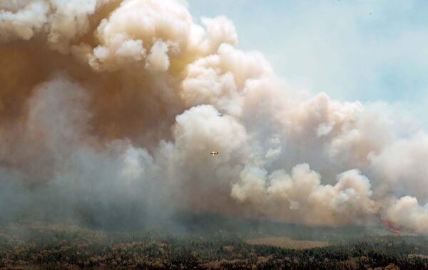 An aircraft, centre, flies near a wildfire burning near Barrington Lake in Shelburne County, Nova Scotia, on Wednesday, May 31, 2023.HO/The Canadian Press