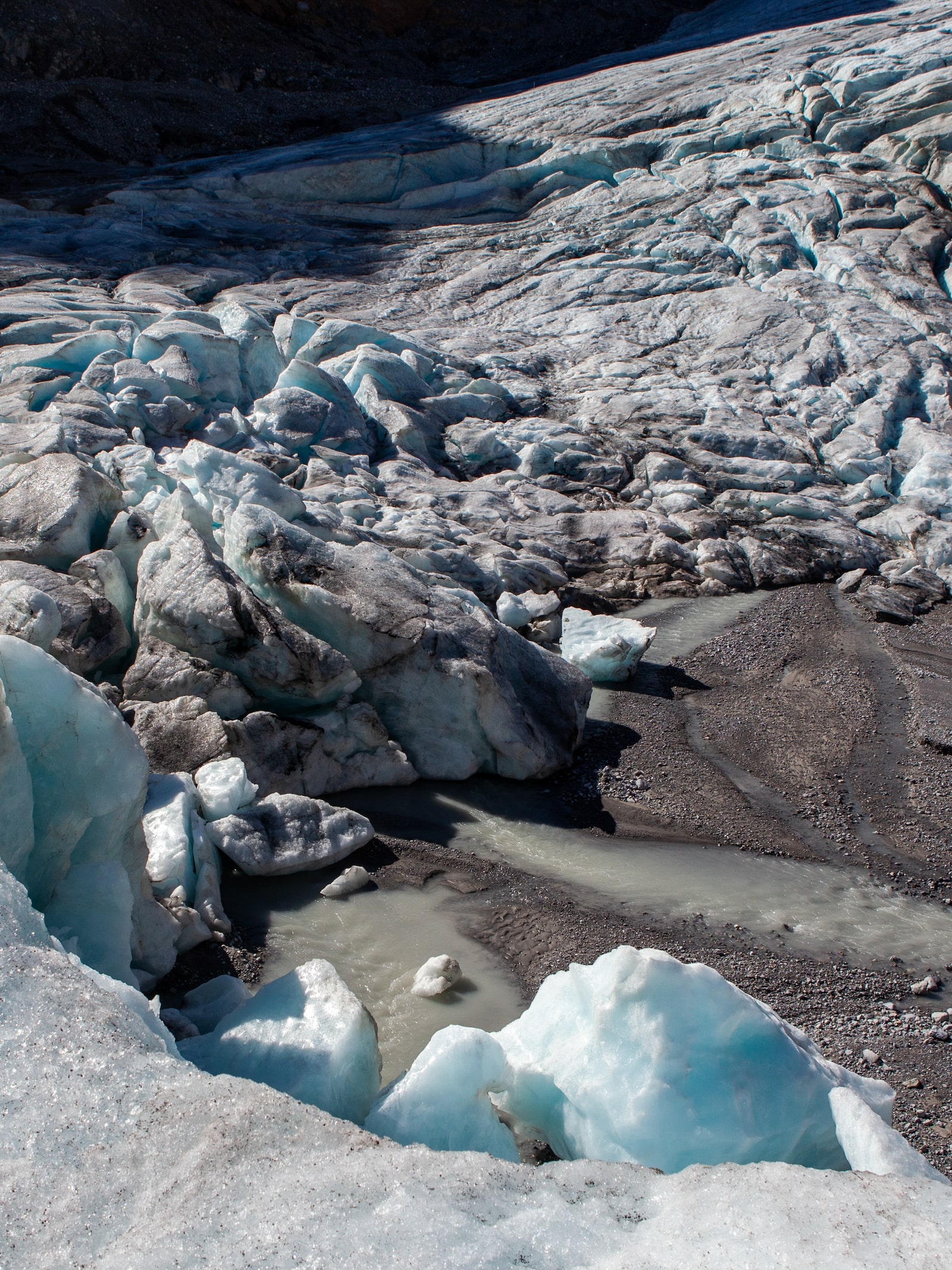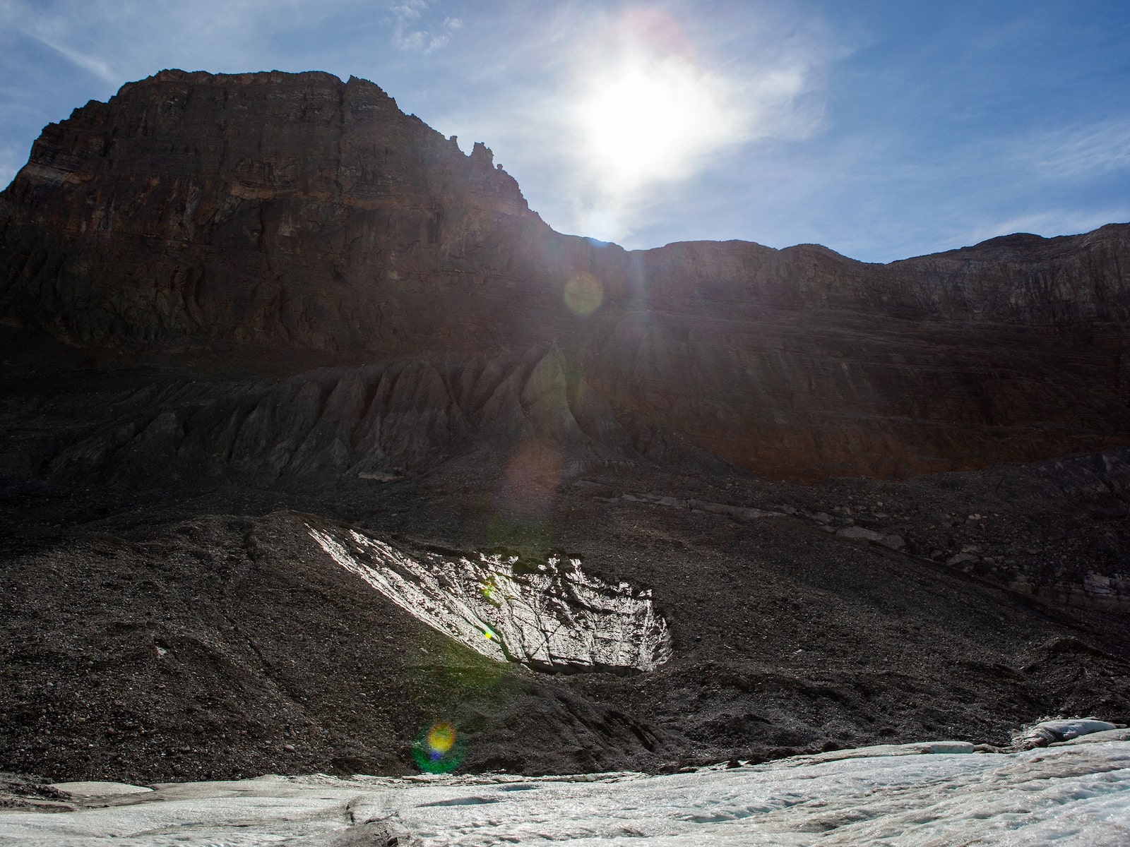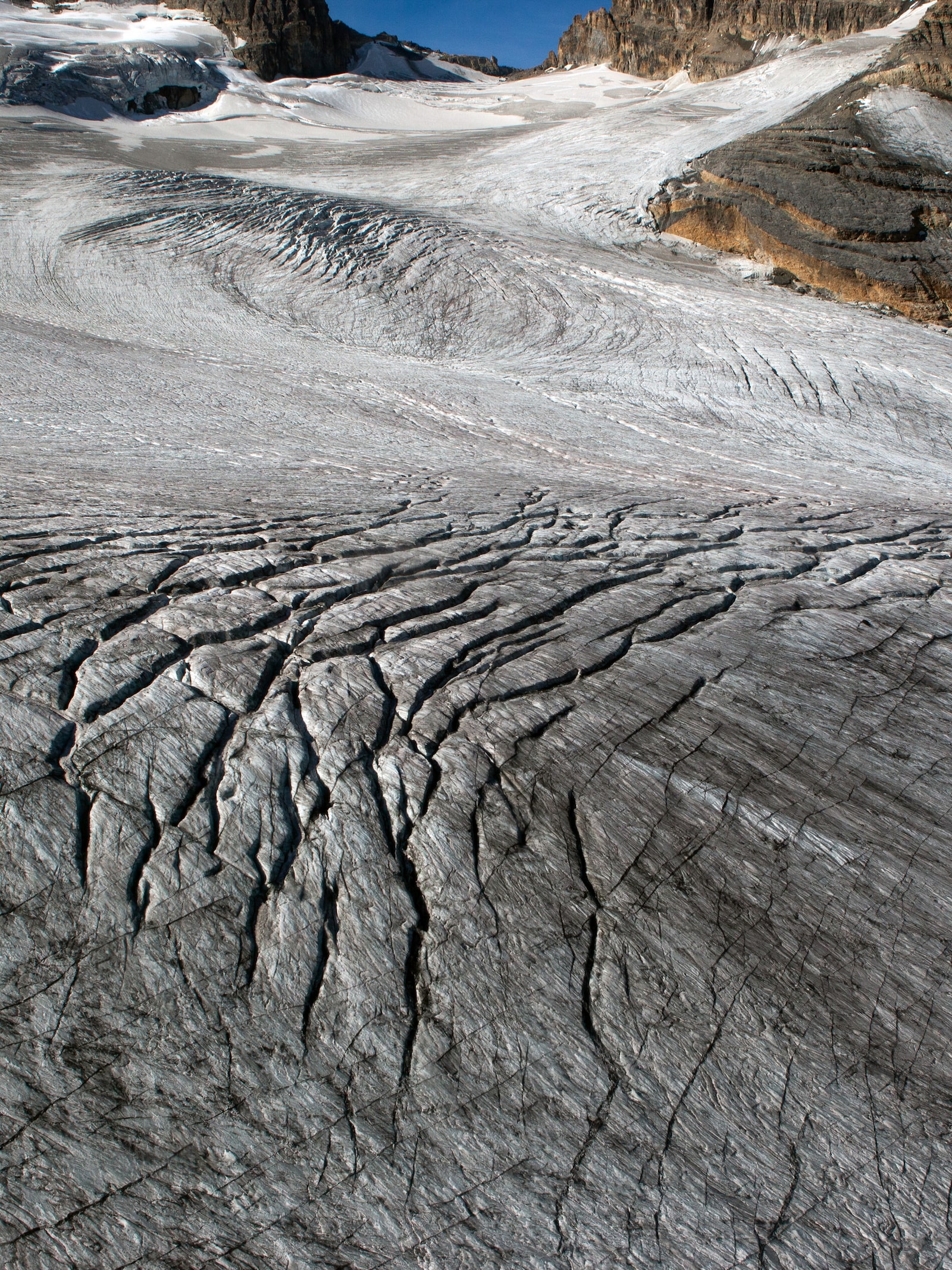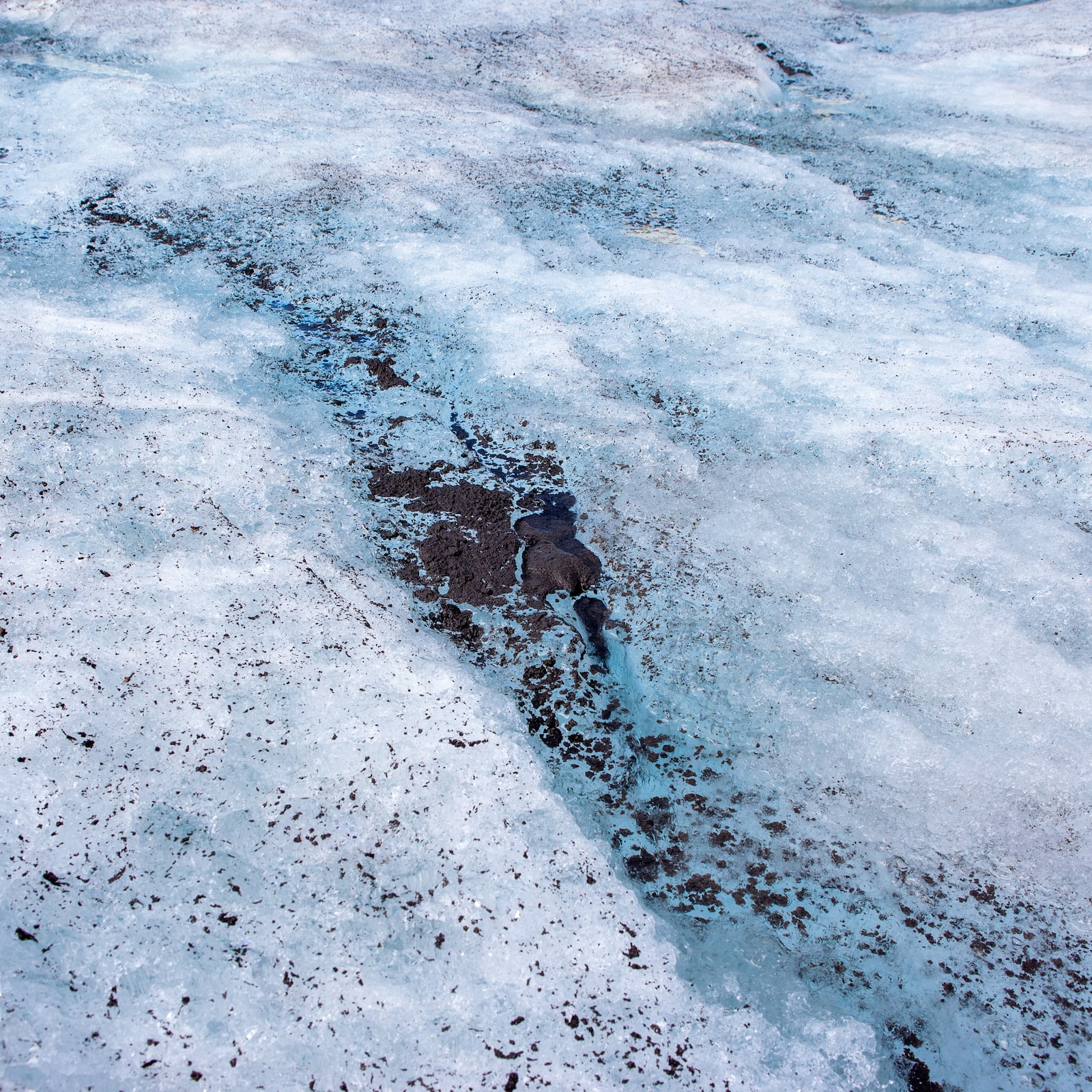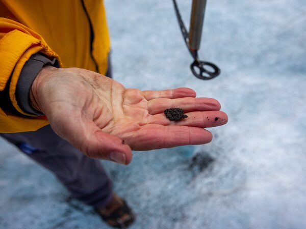 Cryoconite, a powdery windblown dust made of a combination of small rock particles, soot and microbes, can be found all over Peyto Glacier.