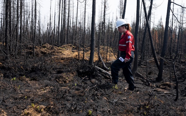 Society of Protection of Forests from Fire prevention agent Melanie Morin walks through an area of burned forest in the area surrounding Lebel-sur-Quevillon, Que. on July 5.Adrian Wyld/The Canadian Press