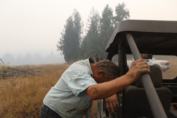 James Krebber catches his breath after fighting wildfires burning near his property in Neskonlith, B.C., on Aug. 20.Aaron Hemens/The Globe and Mail
