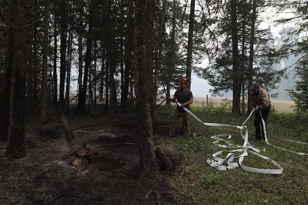 Neighbours help put out spots fires in forestry behind the Allgaier property in Neskonlith, B.C., on Aug. 20.Aaron Hemens/The Globe and Mail