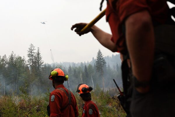 Firefighters with the British Columbia Wildfire Service Titan unit crew watch as a helicopter drops water on the southeastern flank of the Bush Creek wildfire in Turtle Valley after it destroyed homes and other structures in multiple communities in the North Shuswap region of B.C. on Aug. 23, 2023.JESSE WINTER/Reuters