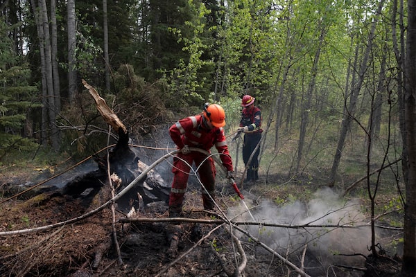 Wildland firefighters work to extinguish embers in a forested area of Shining Bank, Alta., on May 19, 2023.JEN OSBORNE/The New York Times News Service