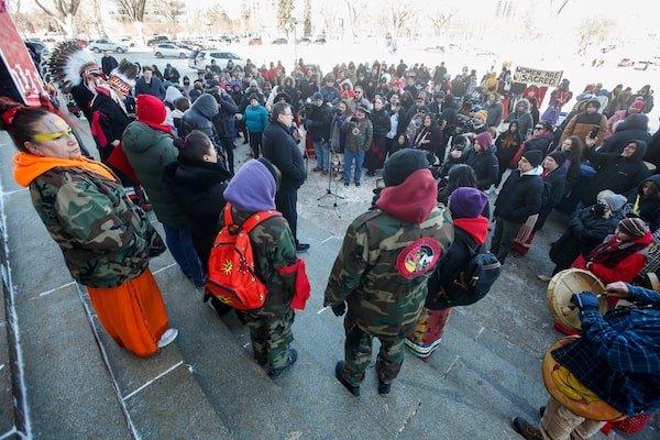 Family and supporters gather at the Manitoba Legislature to protest the government delays in searching landfills for missing Indigenous women, in Winnipeg on March 8.JOHN WOODS/The Canadian Press