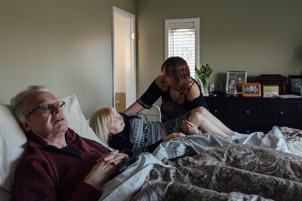 Early in the morning, Sherri Ferguson helps her mother out of bed and into a wheelchair. Peter Ferguson, left, is still lying in bed.