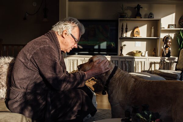 Peter Ferguson shares a moment with the family dog. Mr. Ferguson, 77, lives with chronic pain from a botched hip-replacement surgery.